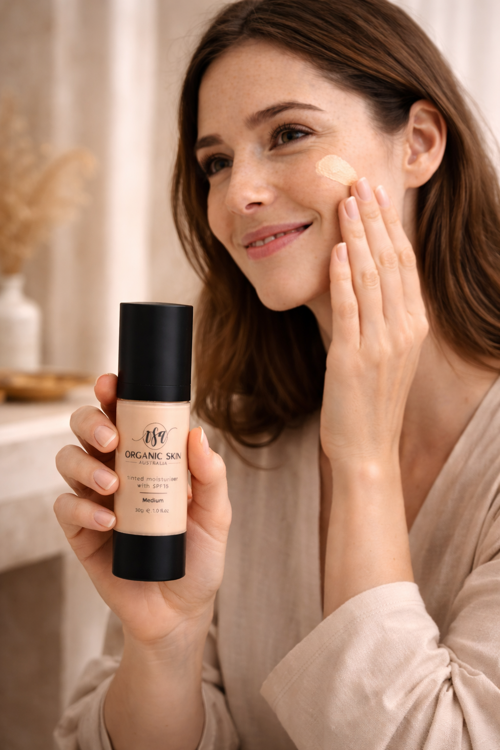 Apply a small amount of Tinted Moisturiser to cleansed skin and blend with fingertips or a makeup sponge.
